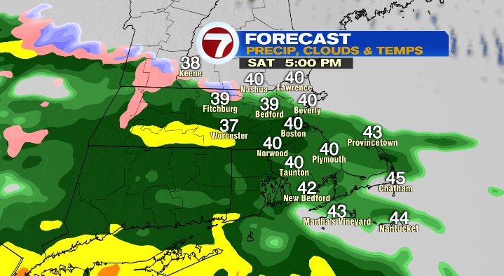 Rain showers will turn into widespread from 4-6 p.m. this night. Be additional cautious in northern Worcester County and southern New Hampshire, the place it might briefly start as snow, a mixture and even some freezing rain earlier than switching over to plain rain.