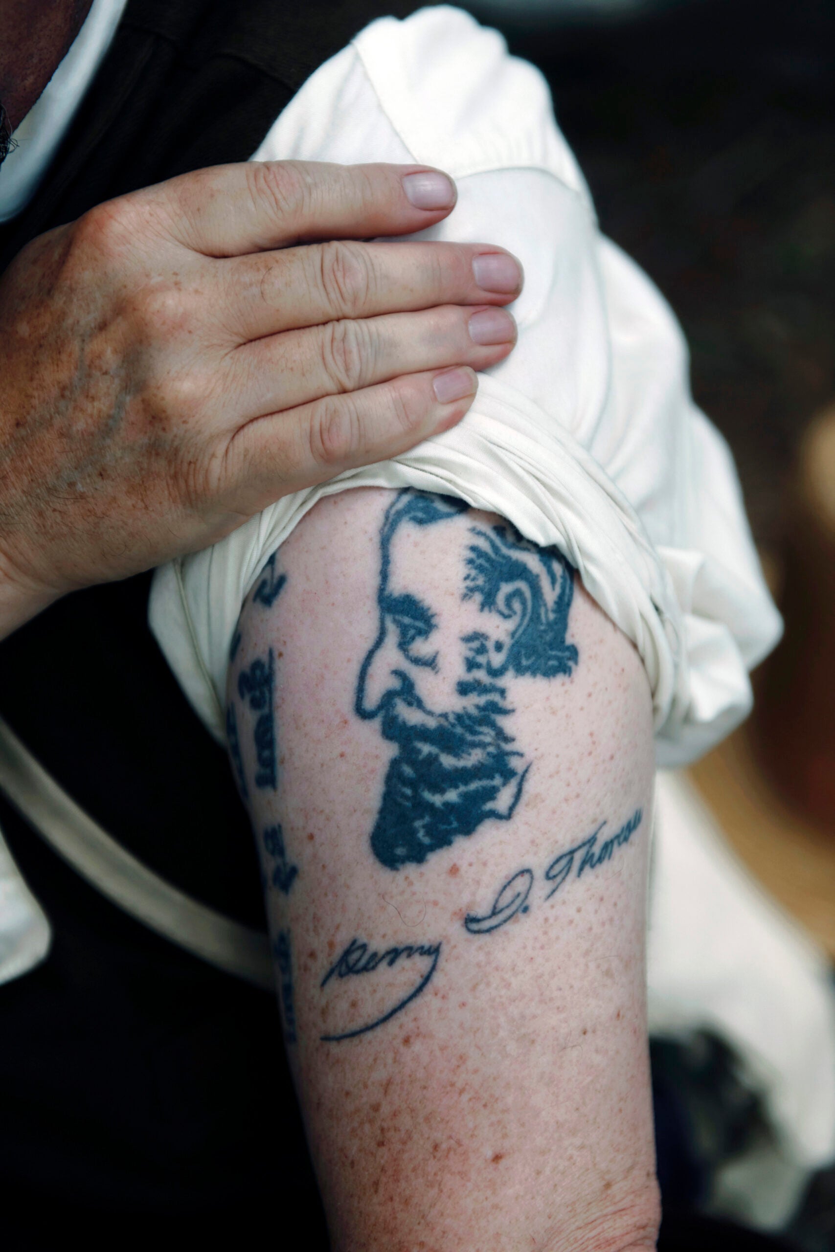 He rolled up his sleeves to indicate the tattoos protecting his arms, which included depictions of Emerson and a long-bearded Thoreau.