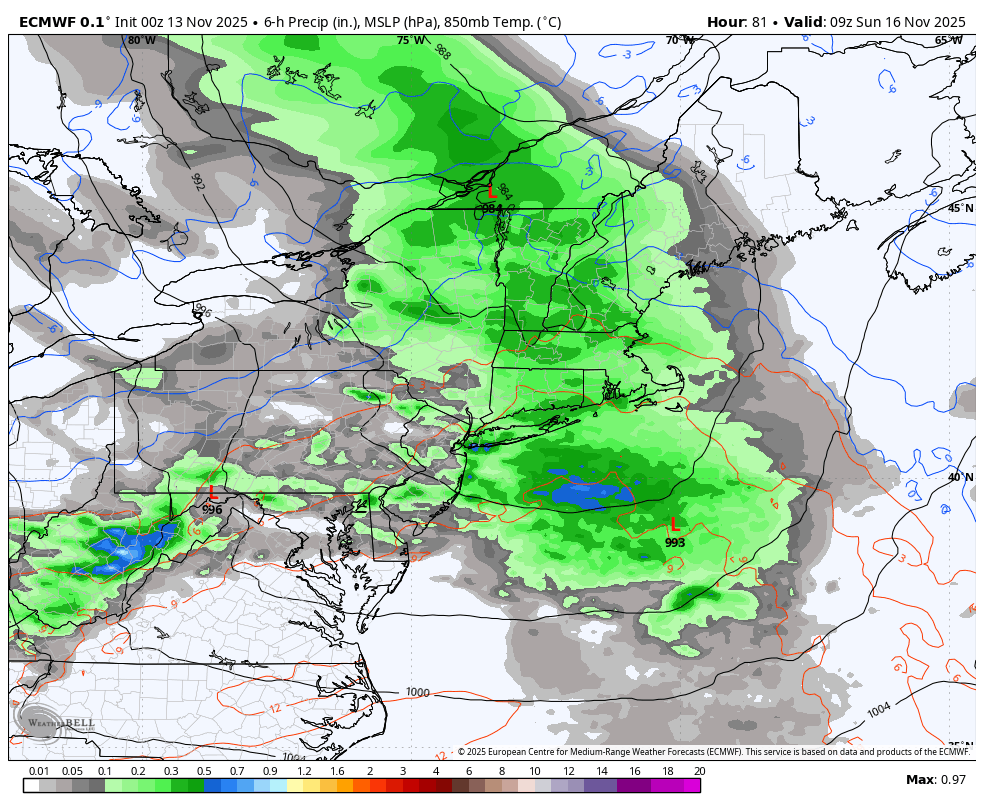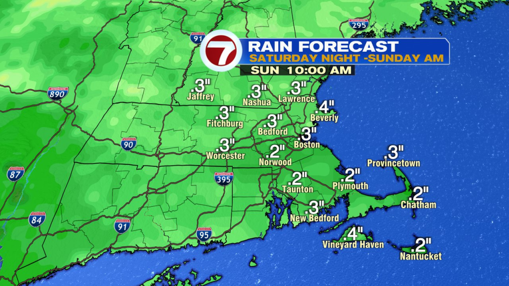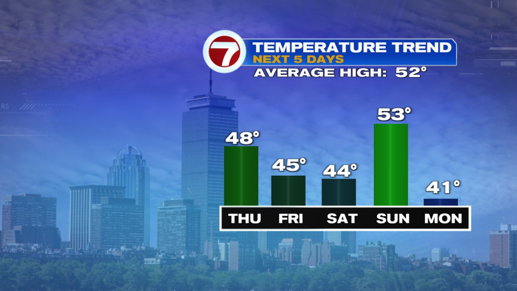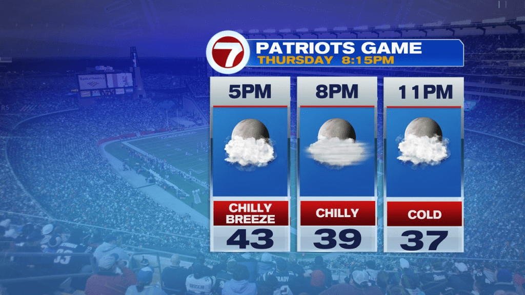 Temps rebound into the mid 40s to close 50 immediately beneath a largely cloudy sky. Whereas we’ll catch a passing bathe/few sprinkles, we’ll nonetheless have many dry hours by means of the day. That’ll embrace this night in Foxboro as skies filter out round kickoff, permitting for a cool, however dry recreation in opposition to the Jets.