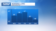 Highs will solely attain the 60s Saturday with crisp nights this weekend, undoubtedly feeling like fall each Saturday and Sunday mornings. Sunshine and seasonable air proceed into early subsequent week as excessive strain stays in management.