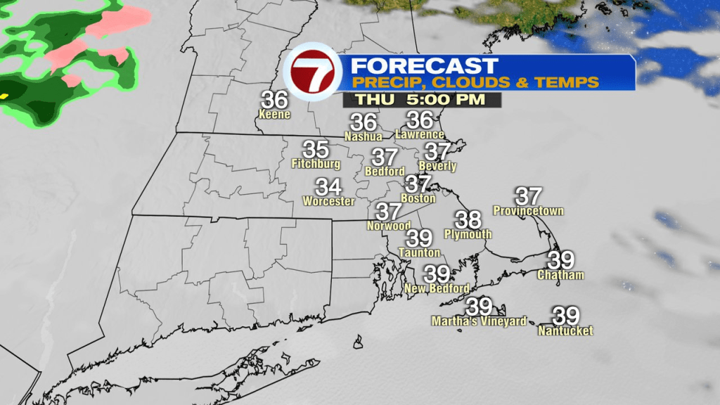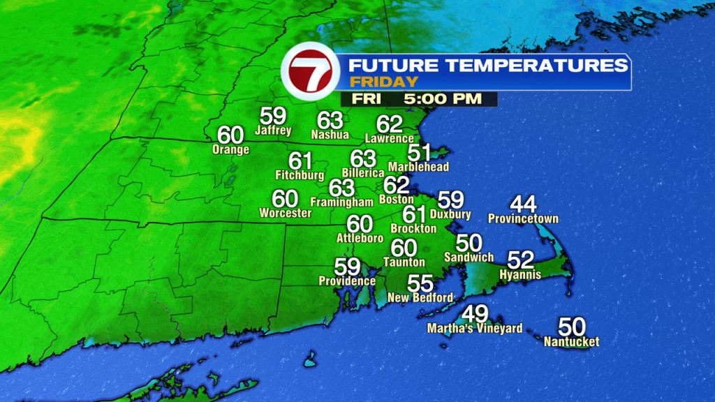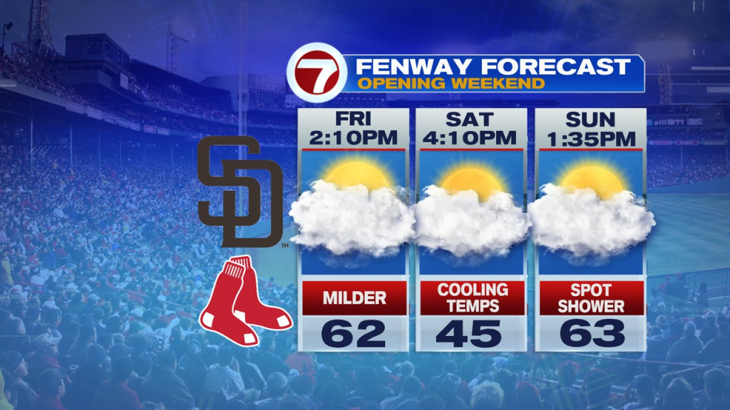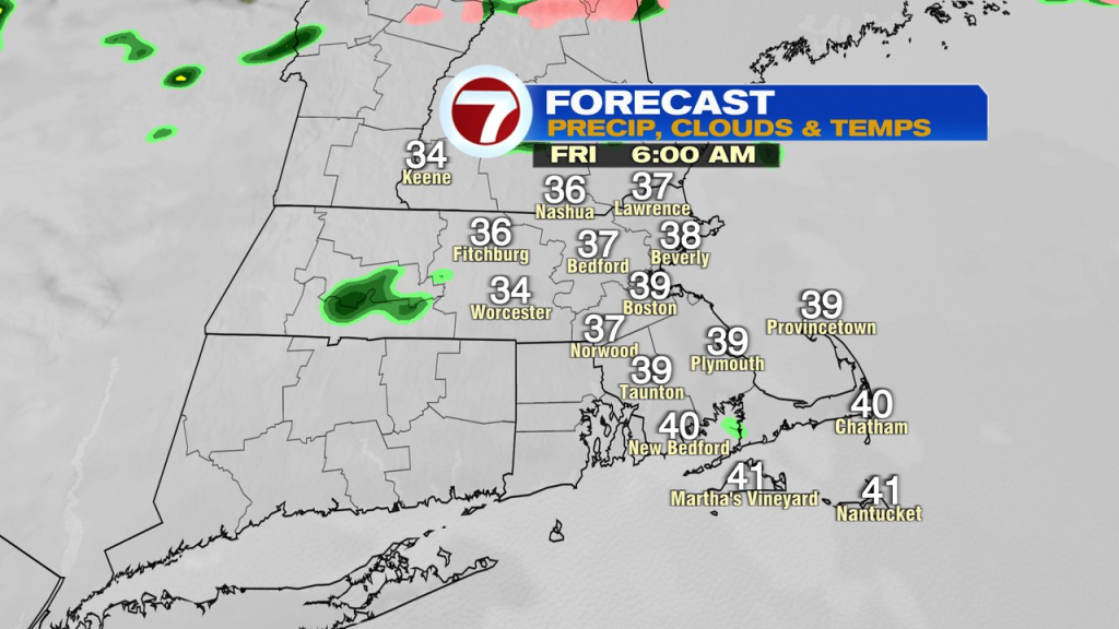 Friday begins off the place we ended Thursday… higher 30s with spotty showers/drizzle early. Steadily, we’ll see enhancements as we shake off the northeast wind and temps heat to close 50 by noon, after which bump up into the low to mid 60s by late afternoon with just a few breaks of solar. Heading to Fenway? Pregame temps are cool, close to 50, however heat into the 60s by the mid to late innings.