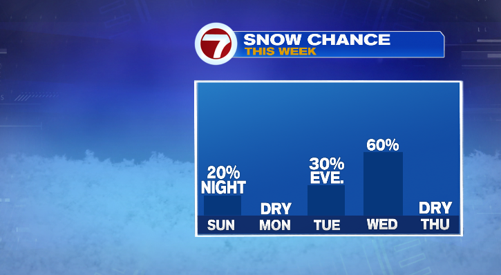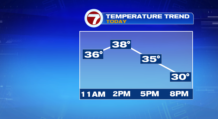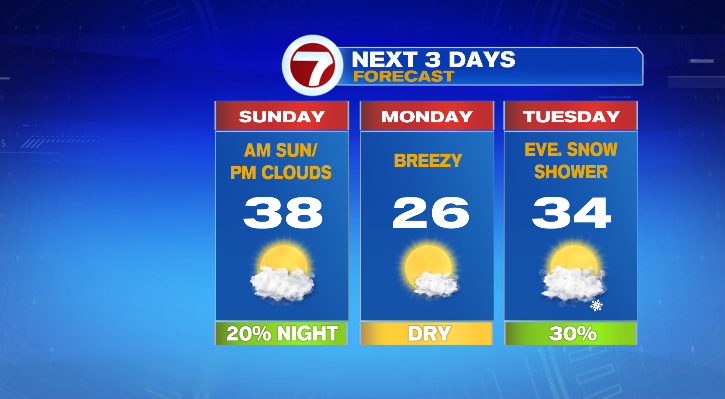 Within the afternoon we’ll attain the low to mid 30s. Skies will probably be partly sunny with an opportunity for night snow showers.