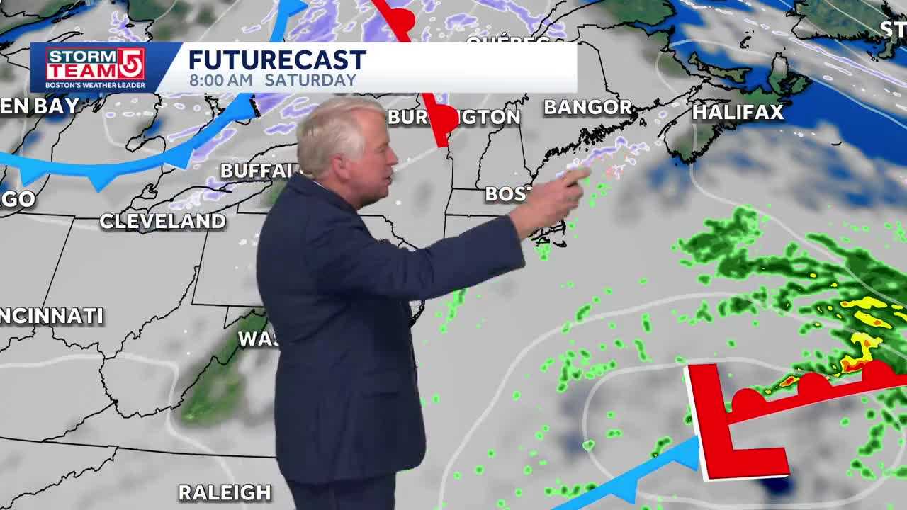 IT? FREEZING. JUST A TAD FREEZING. HEY, TODAY MARKS A SPECIAL POINT BECAUSE TODAY WE BEGIN THE EARLIEST SUNSETS OF THE YEAR. THIS GOES ALL THE WAY UNTIL NEXT THURSDAY. THE SUNSET TONIGHT AND THROUGH NEXT THURSDAY IS AT 411. NOW, BY NEW YEAR’S DAY, WE COME BACK OUT OF THE CELLAR. IT’S AT 422, AND BY FEBRUARY 2ND, GROUNDHOG DAY, WE’RE BACK UP TO 5:00. SO THIS IS THE DARKEST WEEK OF THE YEAR. AS YOU LOOK OVER THE BOURNE ROTARY RIGHT NOW, AND IN BOSTON RIGHT NOW, IT’S 25 DEGREES. THE WIND AT LEAST IS NOT BAD. LAST NIGHT THAT WIND WAS HOWLING 40 AND 50 MILES AN HOUR, WHICH DROVE THAT WIND CHILL SO LOW LAST NIGHT. AND WHY IT WAS SO COLD. BUT THE WIND TONIGHT IS LOOKING MUCH GENTLER. SO WE’RE GOING TO SEE SOME CLOUDS COMING IN TONIGHT OVER THE NEXT 12 HOURS. SO NOT AS COLD TONIGHT AS WHAT IT WAS LAST NIGHT. AND THEN ON OUR RADAR, WE HAVE ANOTHER SHOT OF AN ARCTIC AIR MASS COMING IN ON MONDAY. SO REMEMBER WHAT WE DID LAST NIGHT. WE’RE GOING TO DO THE SAME THING ON SUNDAY NIGHT INTO MONDAY. SO AGAIN MONDAY LOOKING LIKE A VERY COLD DAY, KIND OF LIKE WE HAD TODAY. AND AS I LOOK AT THE WEEKEND, IT’S MOSTLY DRY. BUT TOMORROW WE COULD SEE A FEW RAIN OR SNOW SHOWERS OUT THERE. NOT LOOKING LIKE IT WILL AMOUNT TO ANYTHING, BUT JUST WANTED TO GIVE YOU A HEADS UP THAT THAT IS OUT THERE. SO WE’VE GOT A LOT OF CLOUDS THAT ARE KIND OF WORKING THEIR WAY IN, BUT THE RAIN, SNOW IS REALLY OFFSHORE AND ONCE THE SYSTEM GOES WAY OFFSHORE, IT PULLS MOST OF MOISTURE WITH IT. BUT THERE MAY BE JUST ENOUGH KIND OF HANGING AROUND THAT WE GET A FEW SNOW SHOWERS OR RAIN SHOWERS COMING IN TOMORROW. SO HERE’S THE MAP. TOMORROW MORNING, 8:00. NOTICE HOW THE RAIN AND SNOW IS WELL OFFSHORE. BUT WE ALSO HAVE THESE LITTLE BANDS THAT KIND OF DEVELOP OUT THERE. SO THAT WILL BE THE THREAT WITH US TOMORROW. AND THEN SUNDAY IS FAIRLY QUIET, SUNNY AND NOT TOO BAD ON THE TEMPERATURES. BUT BY SUNDAY NIGHT HERE COMES ANOTHER FRONT THROUGH. AND THAT ARCTIC FRONT MEANS A NEW BLAST OF COLD AIR COMING IN. AND OF COURSE, SUNDAY NIGHT, AS WE SAW LAST NIGHT, THERE MAY BE SOME SNOW SHOWERS OUT THERE WITH IT. AND THEN BEHIND IT, IT GETS REALLY COLD ON MONDAY. SO FOR TONIGHT WE HAVE INCREASING CLOUDS. NOT AS COLD TONIGHT AS LAST NIGHT. AND LIGHT WINDS. LOWS TONIGHT 12 TO 28 DEGREES. THAT’S STILL WAY BELOW AVERAGE. BUT IT’S A LITTLE BETTER THAN LAST NIGHT. AND THEN TOMORROW A MOSTLY CLOUDY DAY. NOW AS I MENTIONED, THERE MAY BE A FEW SNOW OR RAIN SHOWERS 36 TO 42 DEGREES FOR YOUR HIGH TEMPERATURE. SO HIGHS TOMORROW WILL LOOK LIKE THIS AS YOU GO OFF TO THE NORTHWEST. A LITTLE BIT COLDER, ESPECIALLY GETTING THAT SNOW PACK THAT’S OUT THERE, BUT TOWARD THE CAPE WITH SOME SUNSHINE COMING BACK. TEMPERATURES WILL BE LOW, 40S STILL COLD, BUT A LITTLE BIT BETTER THAN WE HAD TODAY. BUT LET ME TIME OUT THE SNOW THREAT FOR YOU AFTER MIDNIGHT TONIGHT. THERE’S A LOT OF CLOUDS OUT THERE. THERE MAY BE A FEW FLURRIES THAT KIND OF FLOW THROUGH. I DO THINK THE BEST CHANCE FOR SEEING SNOW WILL BE TOMORROW MORNING THROUGH THE MID AFTERNOON HOURS, ESPECIALLY OUT TOWARD THE WEST, BUT AGAIN, LIMITED, LIMITED MOISTURE. SO I’M NOT LOOKING FOR ACCUMULATION OUT OF THIS ONE. JUST A HEADS UP THAT THAT THREAT IS GOING TO BE OUT THERE. THIS IS AT NOON TOMORROW. NOW AFTER WE GET THROUGH NOON, THESE TEMPERATURES WARM UP ENOUGH SO THERE’S ENOUGH MOISTURE. IT WOULD TURN IT OVER TO A FEW RAIN SHOWERS AGAIN, ALL OF IT LIGHT STUFF. THE MOST YOU’RE GOING TO GET OUT OF THIS IS MAYBE A DUSTING AT BEST. AND THEN WE’LL CLEAR IT AWAY. AND THAT’S WHY YOUR SUNDAY LOOKING PRETTY NICE. ALL RIGHT, HERE’S WHAT IT LOOKS AT OVER THE NEXT SEVEN DAYS. TOMORROW A LOT OF CLOUDS, SPOTTY SHOWER, RAIN OR SNOW, 38 DEGREES IN THE AFTERNOON AND SUNDAY. NOT BAD 38 DEGREES. BUT LATE IN THE DAY THE CLOUDS THICKEN UP. AND THEN SUNDAY NIGHT, HERE COMES THAT ARCTIC FRONT ONCE AGAIN. SOME SNOW SHOWERS UNLEASHING SOME COLD AIR FOR YOUR MONDAY. MONDAY IS GOING TO BE A LOT LIKE TODAY. AND THEN ON TUESDAY WE’VE GOT SOME PARTLY CLOUDY SKIES COMING HERE. BUT LOOK AT THAT. WEDNESDAY AND THURSDAY WE START TO WARM BACK UP, BUT BY THE TIME WE GET TO THURSDAY, THERE MIGHT BE ANOTHER CHANCE OF SEEING SOME RAIN OR SNOW IN THE FORECAST. NO BIG SNOW OR RAIN EVENTS IN HERE, BUT CERTAINLY A LOT OF COLD.