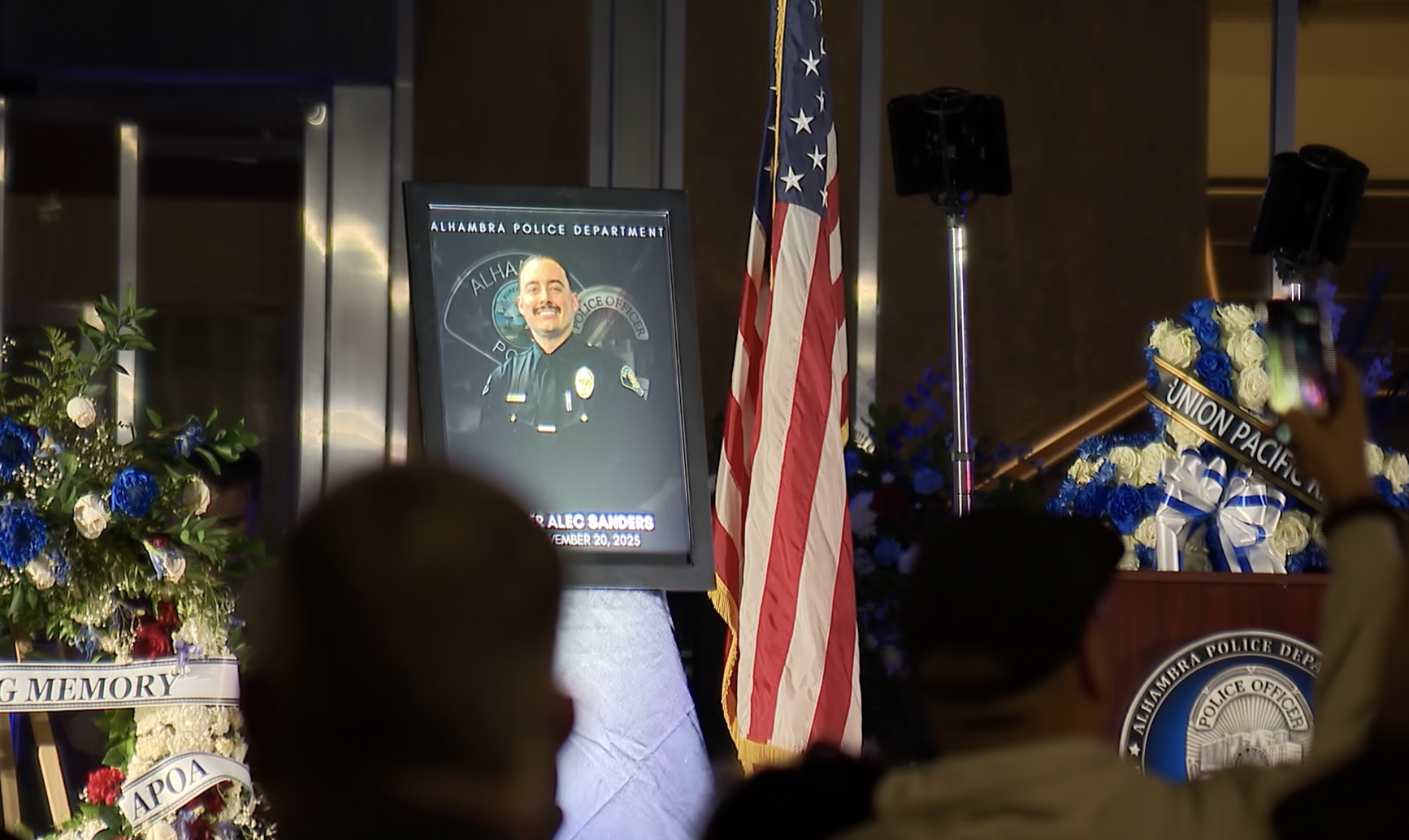 A candlelight vigil in remembrance of fallen Alhambra Police Division Officer Alec Sanders, who was killed within the line of obligation when his patrol cruiser collided with an allegedly stolen SUV throughout a chase, was held Tuesday night time.