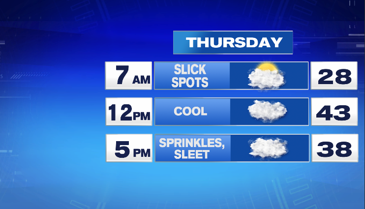 Most of Thursday options clouds from this entrance together with dry circumstances however by early night some sprinkles and sleet pellets are doubtless