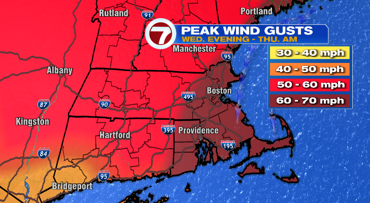 Whereas many wind gusts will attain 35-45 mph, into early Thursday morning they could peak a lot increased. In lots of cases, we might see gusts topping 60 mph, particularly alongside the coast and on the Cape and the islands.