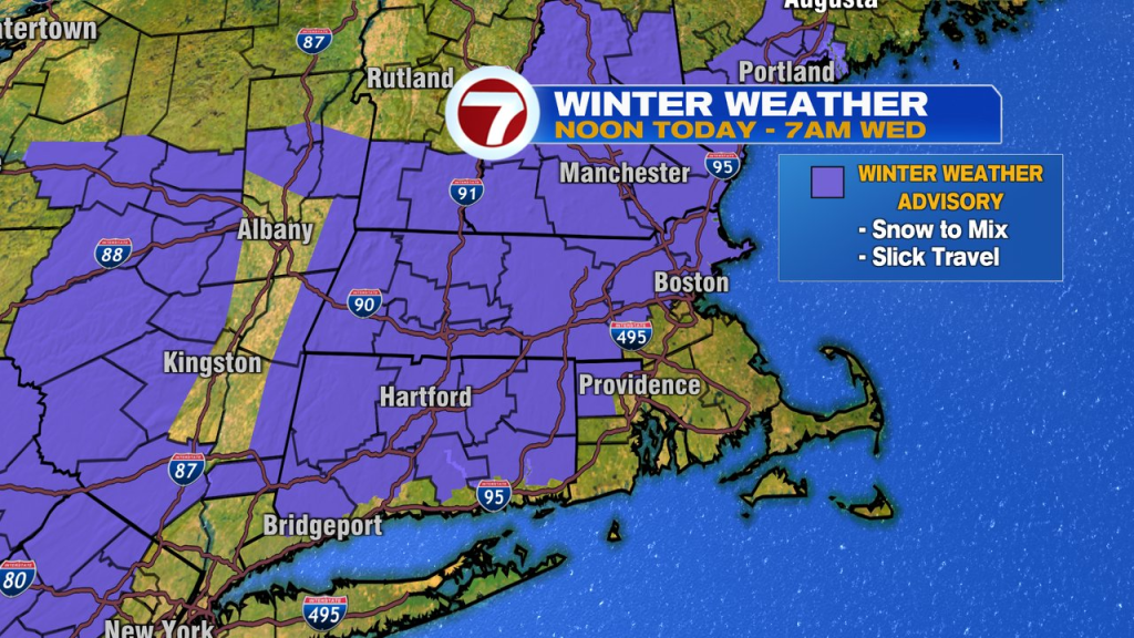 Temps bounce again to close 30 by noon, however we’ll watch clouds advance in and a few snow to initially begin the subsequent system that strikes in. Early to mid afternoon flakes will change to sleet, freezing rain and rain from south to north late-day/night with the icy situations lasting the longest northwest of 495 tonight. Snow totals gained’t be spectacular, typically a coating to some inches, however that, mixed with some sleet and freezing rain will create slick untreated surfaces. A winter climate advisory is up for places close to/northwest of I-95.