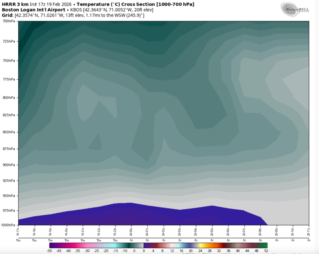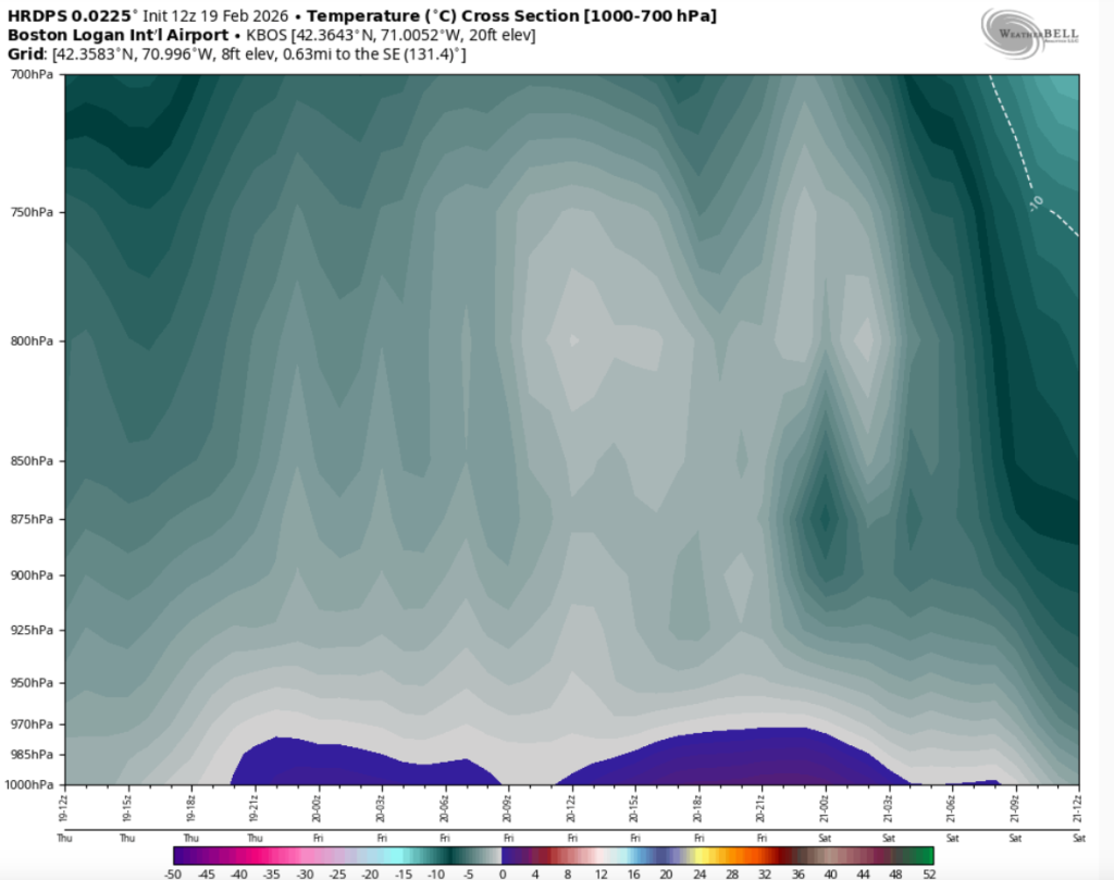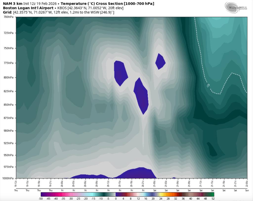 Earlier than that changeover to all snow occurs, there’s that interval of sleet. In some circumstances there’s a transparent sign that there received’t be a lot sleet — like our northern spots with the upper accumulations. And on the flip aspect, there’s areas the place there’s no query about sleet and it’ll even rain (southern spots with decrease numbers). However for some, like Boston, how a lot sleet is kind of a giant query mark. These are cross sections of the environment Friday as seen from three completely different hello decision fashions. We’ll proceed discussing beneath the photographs, however as you scroll, see for those who discover one huge evident distinction between the three… “considered one of this stuff isn’t just like the others“.