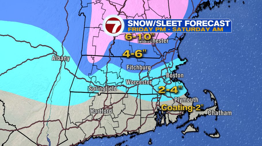 You’ll most likely get up to somewhat sunshine tomorrow morning with clouds thickening by way of the morning earlier than the ‘mess’ arrives Friday afternoon. Highs tomorrow will return to the 30s and again above freezing. That’s all a part of the forecast problem. When every little thing is alleged and executed, the best snow totals from Friday afternoon by way of Saturday morning shall be the place there’s little or no contamination with sleet and most, if not all, of the precipitation falls as snow. That’s northern Worcester county, the Merrimack Valley, and southern New Hampshire the place we anticipate widespread 4-6″ of snow. The place some mixing occurs, we’ll see 2-4″ which incorporates most cities down the pike from Worcester to Boston and down the South Shore** (notice the asterisks there, we’ll come again to that). Alongside and south of Route 44, not solely is the precipitation straight rain at instances, you’ll have durations of sleet too, so not a lot accumulation down there.