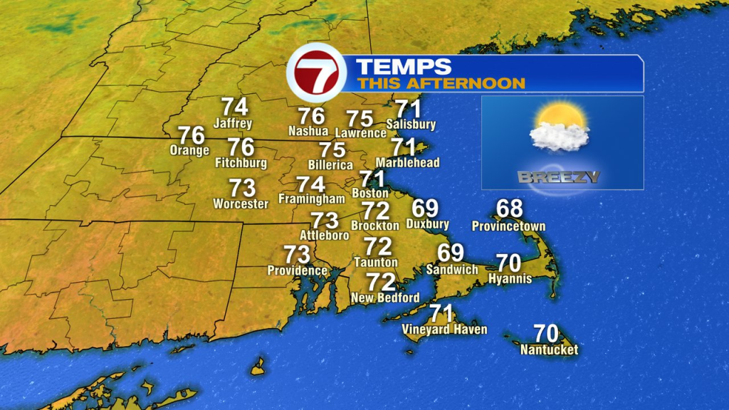 At present, highs attain the low to mid 70s with the best air on the coast. It’ll be dry from begin to end with partly to principally sunny skies. The breeze gusts 20-30mph, strongest for the Cape and Islands. The breeze diminishes late afternoon into this night, permitting for temps to tumble tonight.