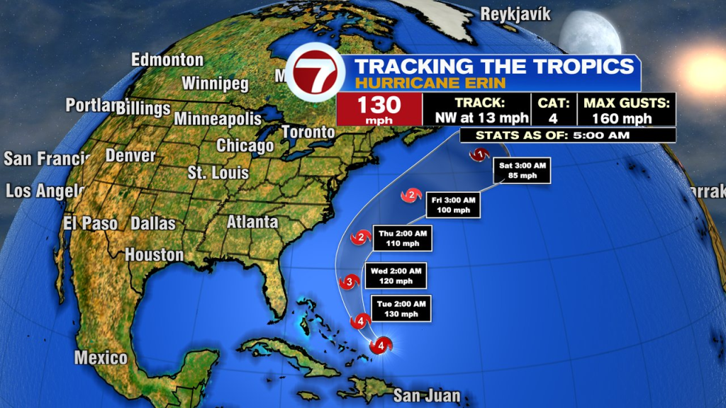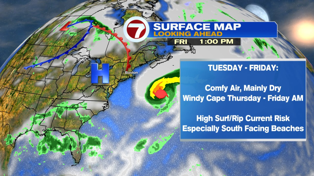 The large story within the Atlantic is Hurricane Erin, which as of 5am this morning is a Cat 4 Hurricane, simply northeast of the Turks and Caicos. Whereas a direct hit will not be within the forecast for the U.S., it’ll get shut sufficient for some outer bands and gusty winds to hit the Outer Banks of North Carolina. As well as, it’ll ship massive swells, excessive surf and excessive rip present dangers again throughout a lot of the East Coast. That’ll embrace south dealing with seashores right here too, proper by the top of the week. Whereas the trail if far sufficient out to sea Thursday and Friday to keep away from any rain from Erin, the stress gradient will tighten sufficient to extend the breeze right here, gusting over 30mph for the Cape and Islands.