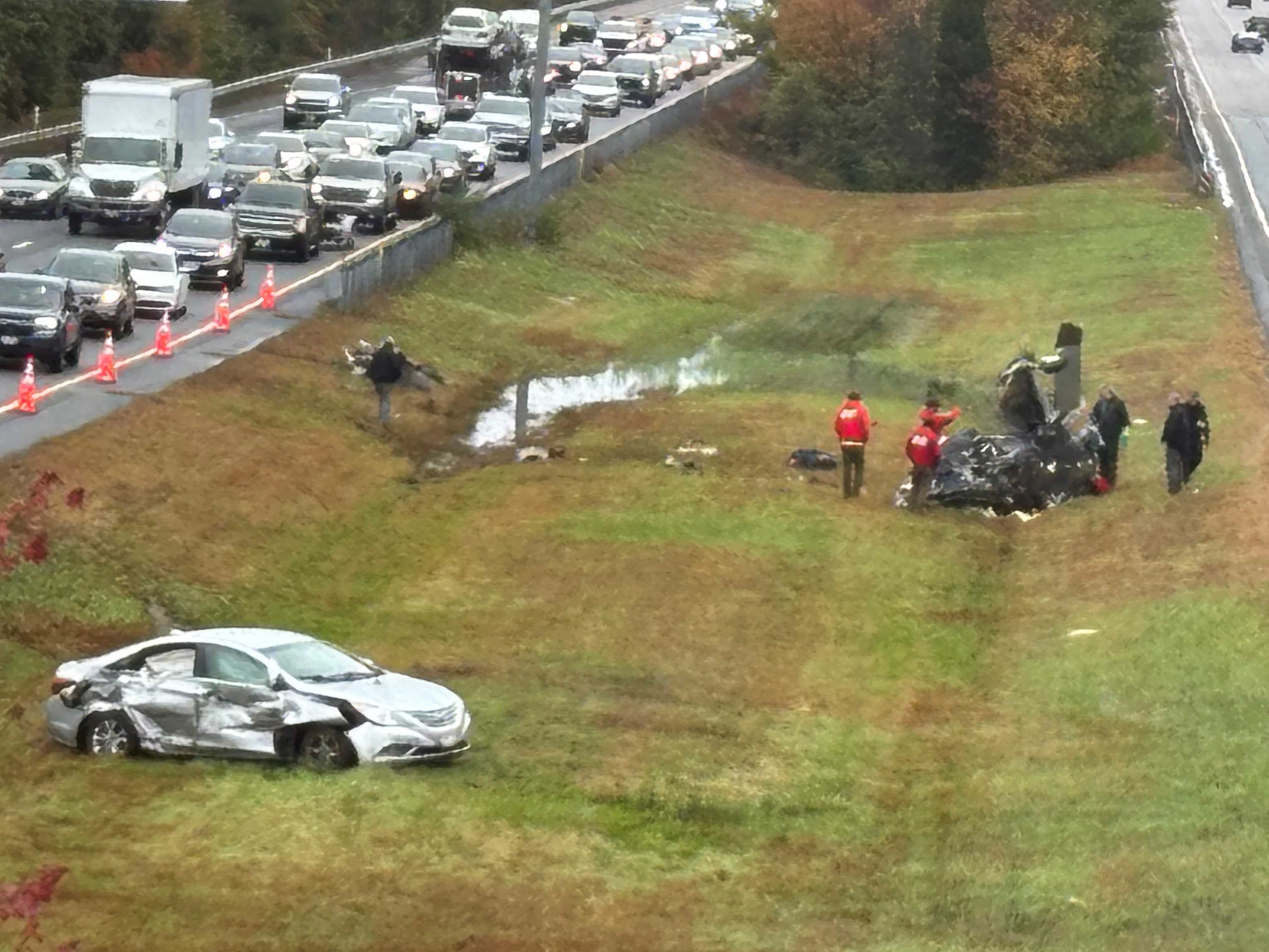 NTSB investigators inspecting wreckage of aircraft that crashed on I-195, killing 2