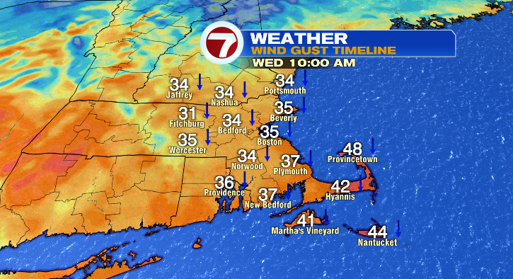 In any other case, it’ll be chilly and windy! Winds will peak later this morning with gusts over 30-35 mph inland, and for the Cape topping 40 mph at occasions.