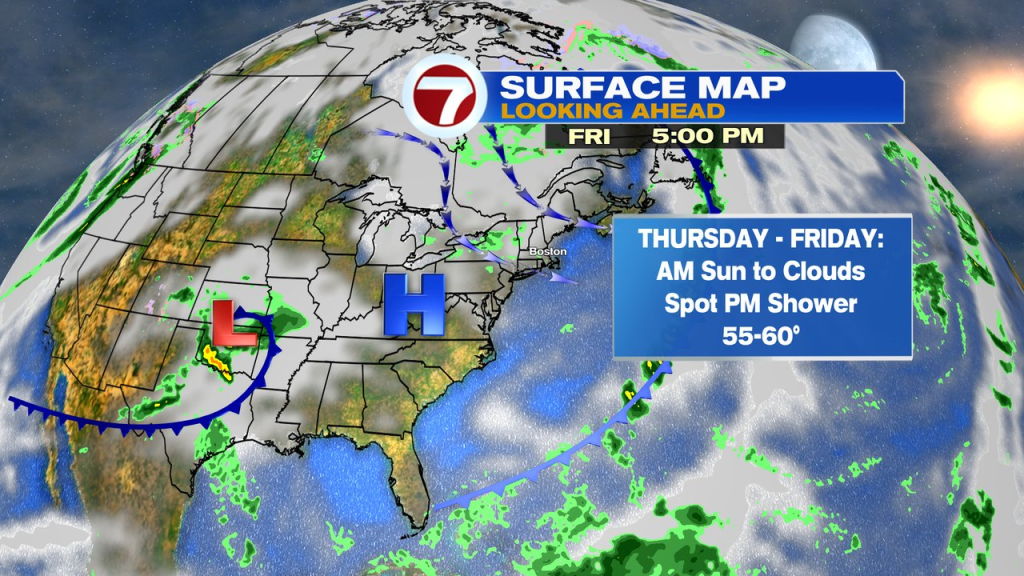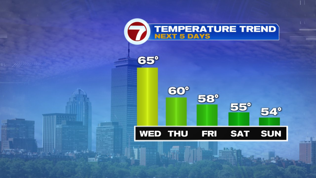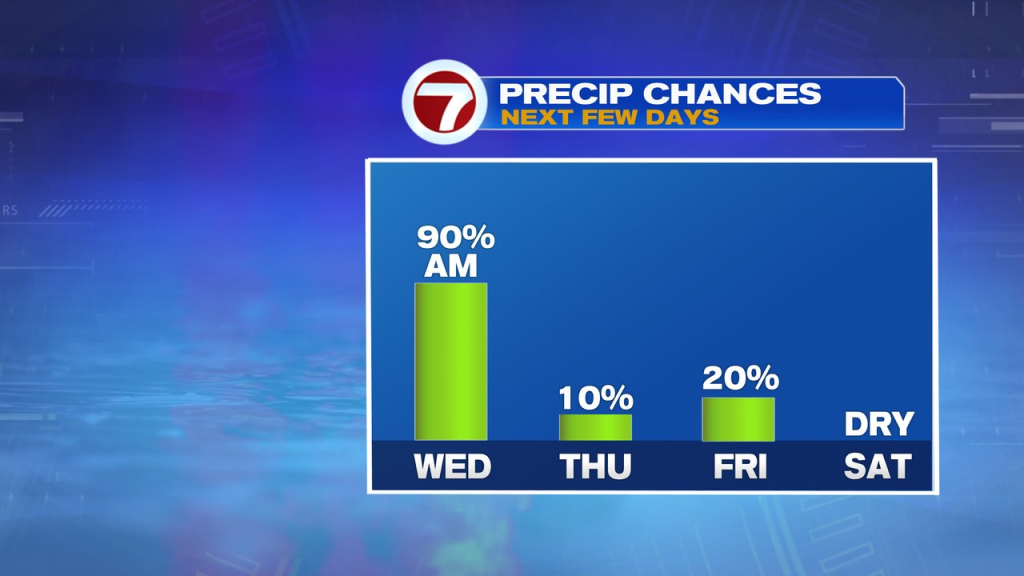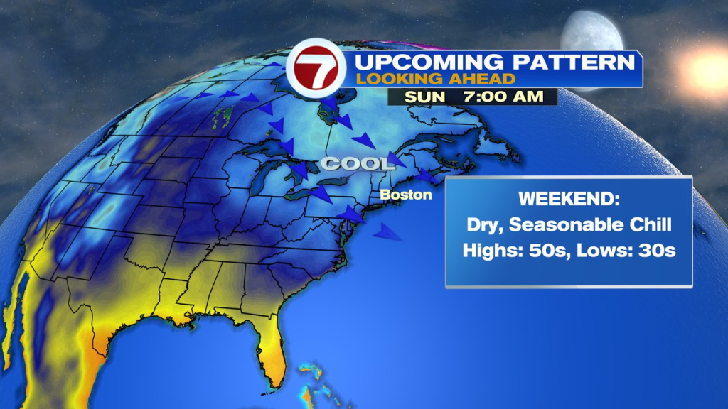By late morning, the rain pushing offshore and breaks of solar return. Whereas we are able to’t rule out an remoted noon/afternoon showers, it’ll usually be dry with a mixture of solar and clouds. Gentle too, with highs within the mid 60s. Whereas a spot bathe or sprinkle is feasible Thursday and Friday afternoon, they’ll be few and much between with each days primarily dry. Dry climate wins out over the weekend too with a seasonal chill within the air as highs head for the 50s and lows dip into the 30s.