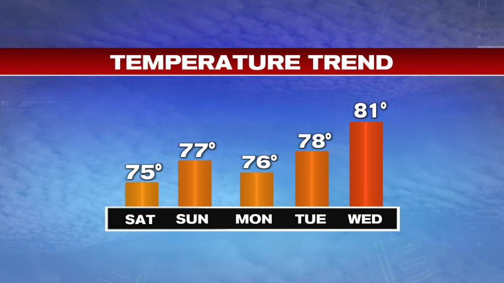 Highs drift again up into the decrease 80s by the center a part of subsequent week as early to mid week stays dry.