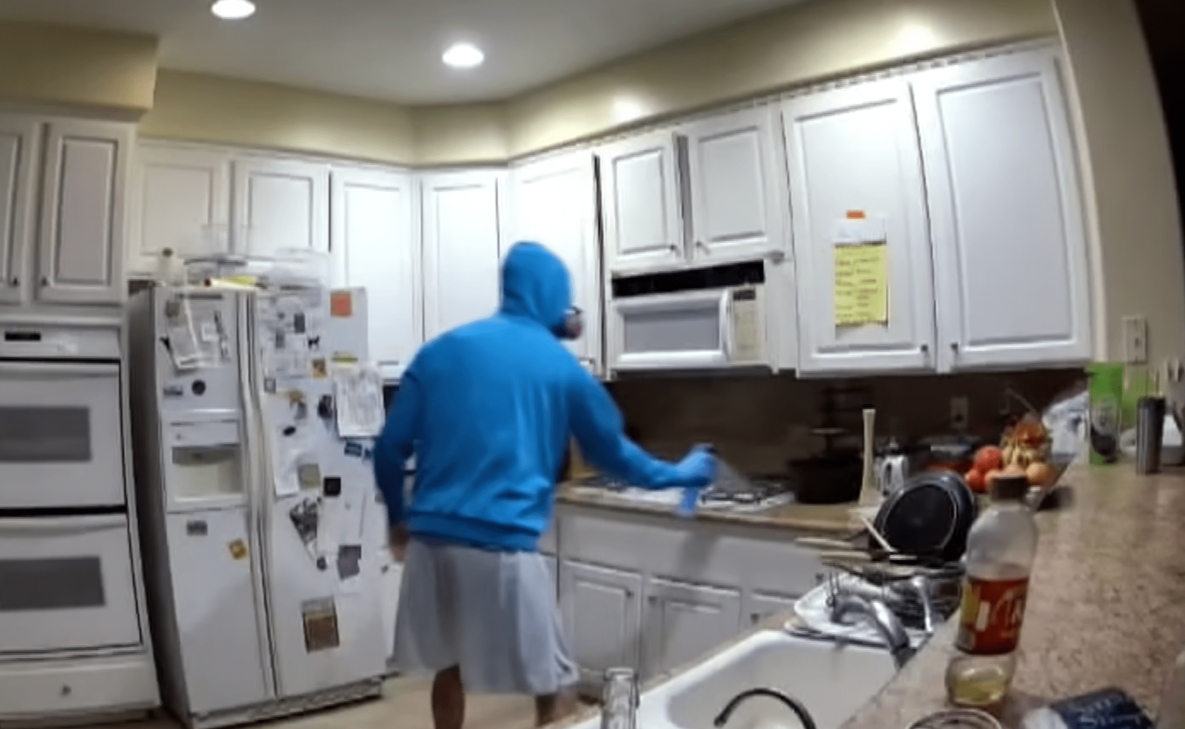 Disturbing video supplied by the owner reveals a person sporting a gasoline masks and a glove spraying an unknown liquid on his roommates’ meals of their kitchen.