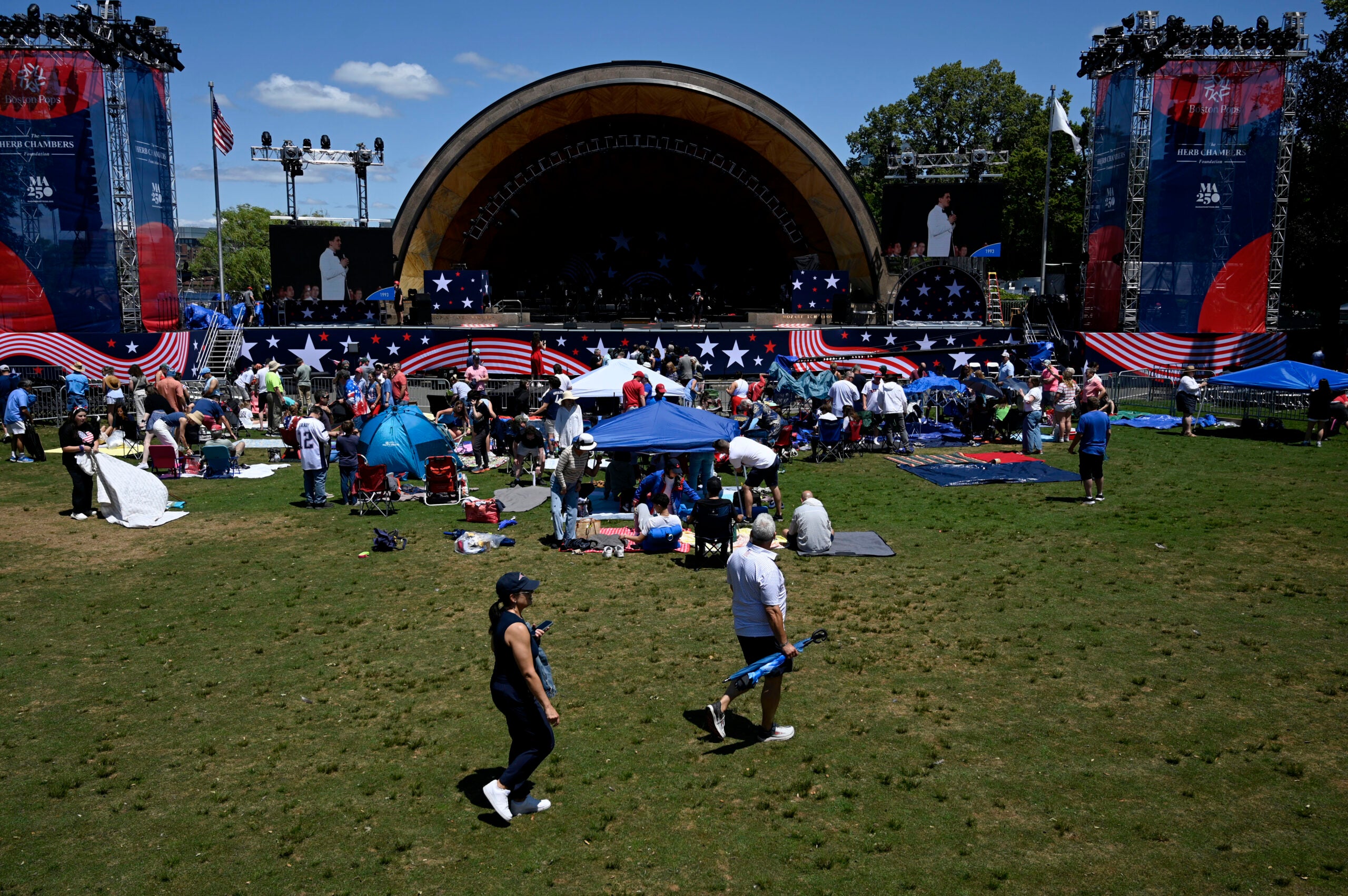 Boston, MA- 7/4/25- The gates opened at midday on the Hatch Shell on the Charles River, welcoming in hundreds of attendees to the Boston Pops Fireworks Spectacular on July Fourth. Attendees convey umbrellas and tents to supply shade as they watch for the live performance to start at 7pm adopted by fireworks. (Heather Diehl for the Boston Globe)