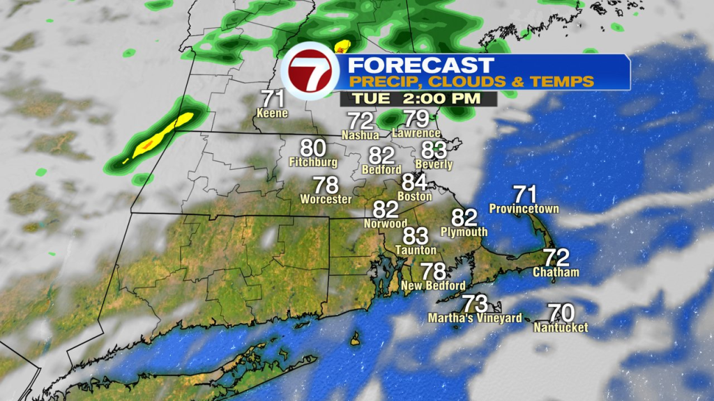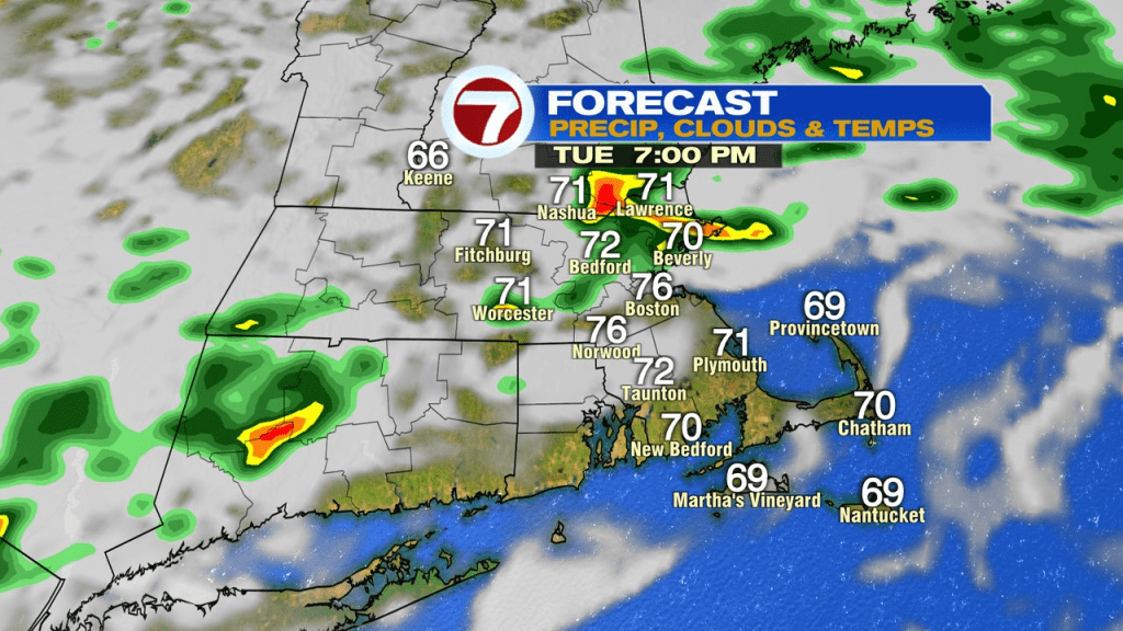 After a number of days in a row of gorgeous Fall climate, we carry summer time heat and humidity at this time as highs head for the decrease 80s for a lot of. We additionally improve the prospect of showers and storms later at this time too. Initially, this afternoon, the very best likelihood will probably be throughout northern Mass and southern NH, then shift farther south close to days finish.