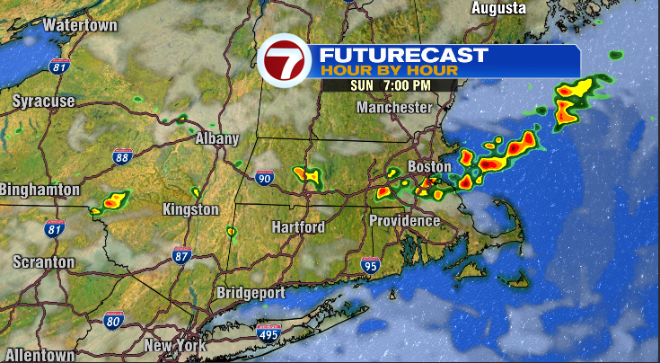 If I used to be pressured to select in the future over the opposite, I assume I’d select Saturday because it gained’t be as sizzling as Sunday and there’s no shot of a late day thunderstorm. Sunday will certainly be hotter inland with afternoon temps near 90 and that warmth (together with an advancing chilly entrance from northern New England) with spark just a few late day thunderstorms. Right here is the simulated radar round 7pm Sunday:
