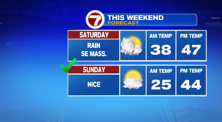 Sunday would be the decide of the weekend! That’s very true in case you’re getting that rain in southeastern Mass on Saturday. It will likely be a bit colder, although. Sunday morning will begin off within the mid 20s.