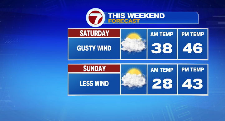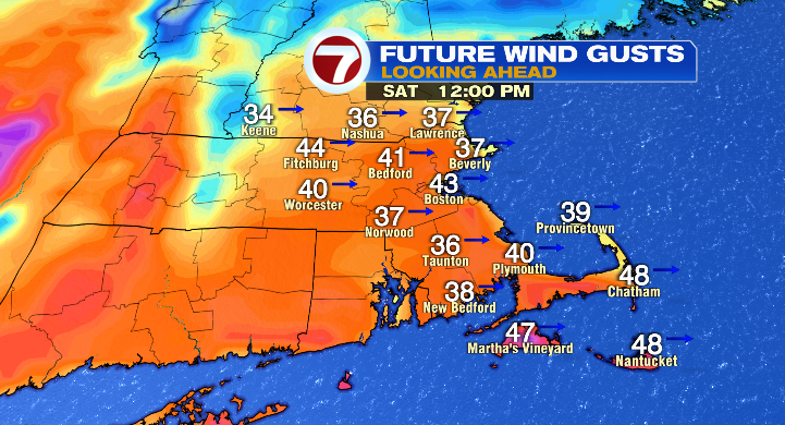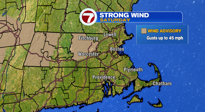 Clouds begin clearing Saturday morning, and we’ll have a mixture of solar & clouds in the course of the day together with highs within the mid 40s. Probably the most impactful a part of the forecast Saturday can be some very gusty winds! Wind gusts can be within the 20s & 30s, with a couple of round 40mph potential! In reality, now we have a Wind Advisory in place for the Worcester Hills from 10 AM – 7 PM Saturday with gusts of as much as 45 mph potential.